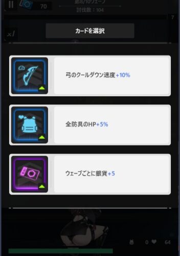 途中でカードを選択します。それらによって武器が強化されていきます。