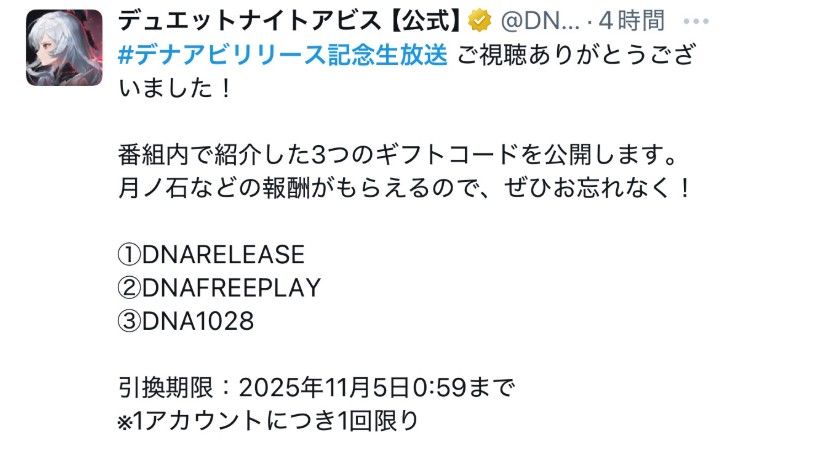 | DNARELEASE | 2025年11月5日0時59分まで | |
