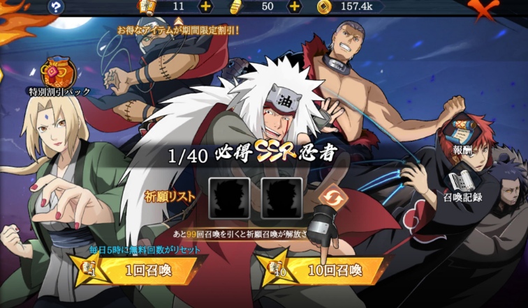 • 登場キャラクター: 100種類以上の忍者が実装されており、おなじみの忍術や奥義を再現したカットイン演出が特徴です。