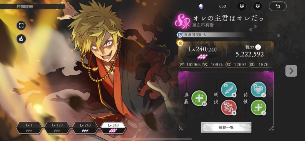 | 奥義 | オレの主君はオレだっ Lv16 敵単体に攻撃力×600%のダメージを与え、20%の確率で3ラウンドの間、攻撃力と会心ダメージを10%減少させる。さらに与えたダメージの30%分の体力を回復する。攻撃終了後、50%の確率で、さらに敵単体に攻撃力×600%のダメージを与える。 |