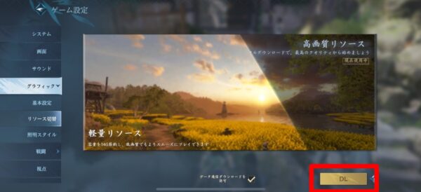 | ゲーム設定のグラフィック⇒リソース切り替え | ![]() |