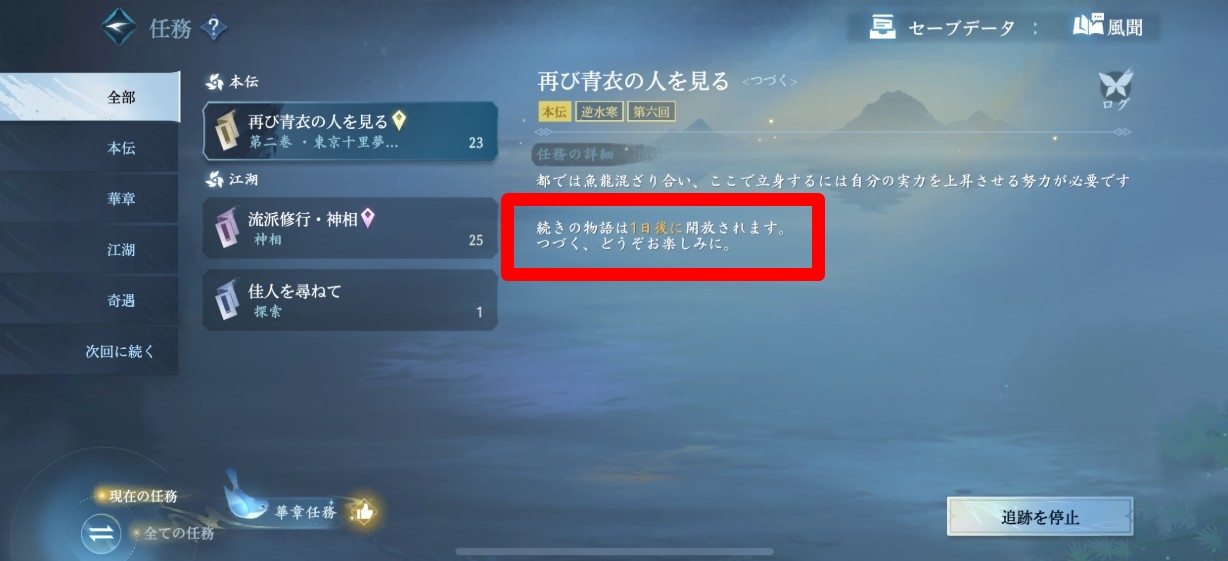 初日は再び青衣の人を見るで終了らしい。続きの物語は1日後に開放されますと表示されています。