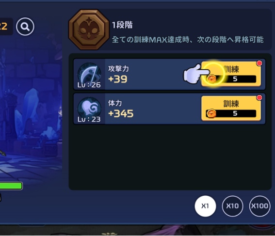 放置系RPGの鉄則通り、まずは「攻撃面」を最優先に強化します。とにかく攻撃力が強くないとサクサクとプレイが進みづらいです。相手を楽々と倒すには体力よりも優先は攻撃力の方です。