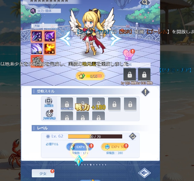 限界突破する上では、優先順位をつけることが大切。パーティ編成少女全員を均等に上げるより、強力なアタッカーを最初は優先して「突破」させるのが放置系ゲームの定石。