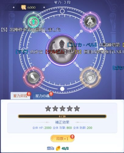 同じキャラ(または同属性のキャラ)を素材にして、キャラクターの「星」を増やします。レベルアップよりも上昇幅が大きく、スキルの性能も強化されます。