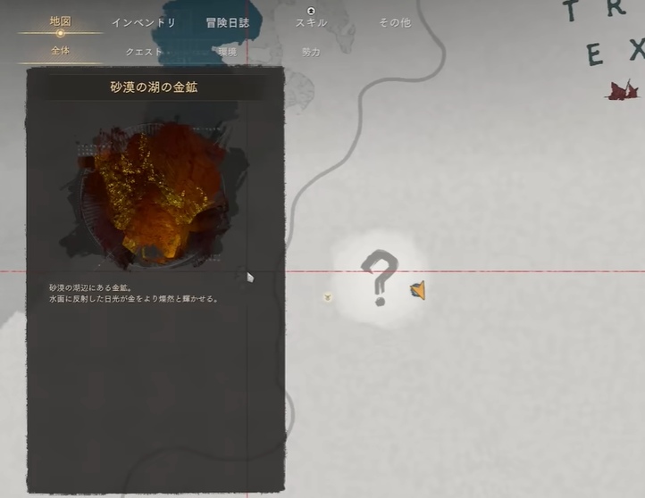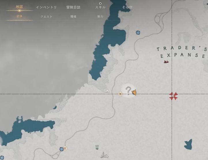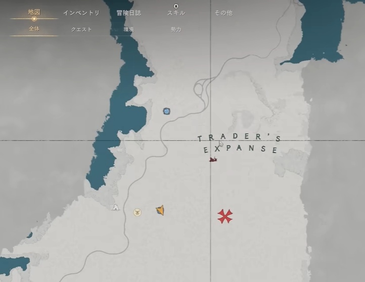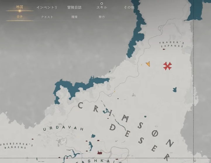 ワールドマップの右上に位置する「クリムゾンデザート」を目指しますクリムゾンデザートの文字よりさらに右上に進むと「トレーダーズエクスパンス」という文字が見つかります。