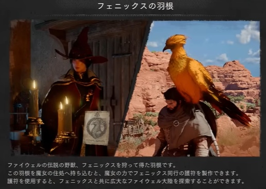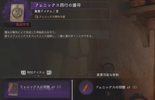 魔女のところで制作合成を行い、「フェニックス同行の護符」を作成しましょう。羽があれば作ることができます。