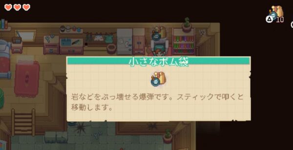 岩などをぶっ壊せる爆弾。スティックで叩くと移動。