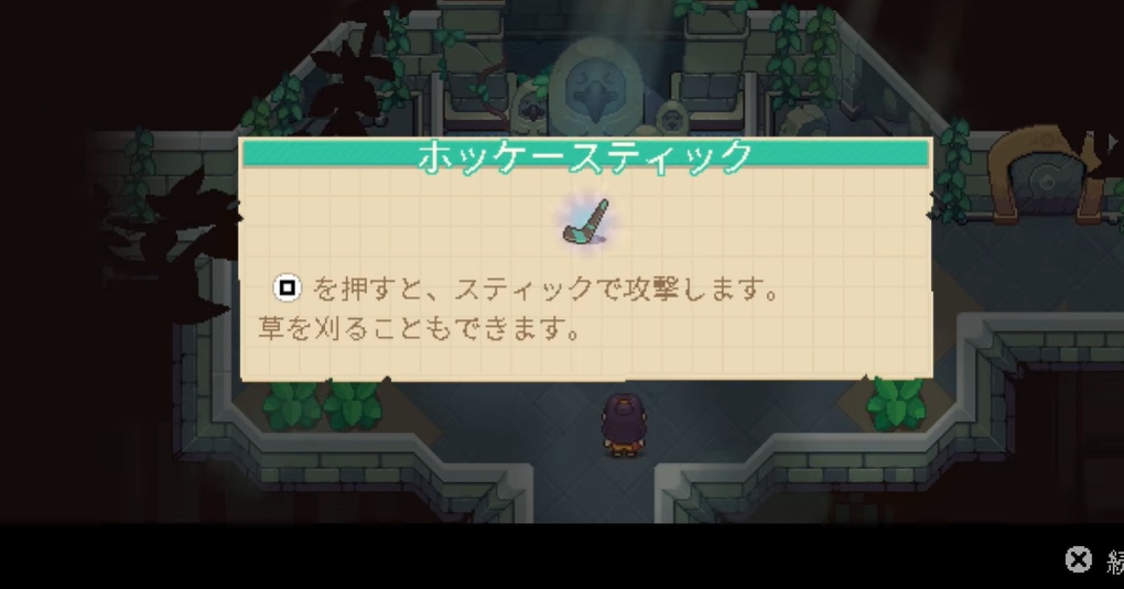 茂みをかき分けるために、ホッケースティック入手。これで草を刈ったり、敵を攻撃したりできます。